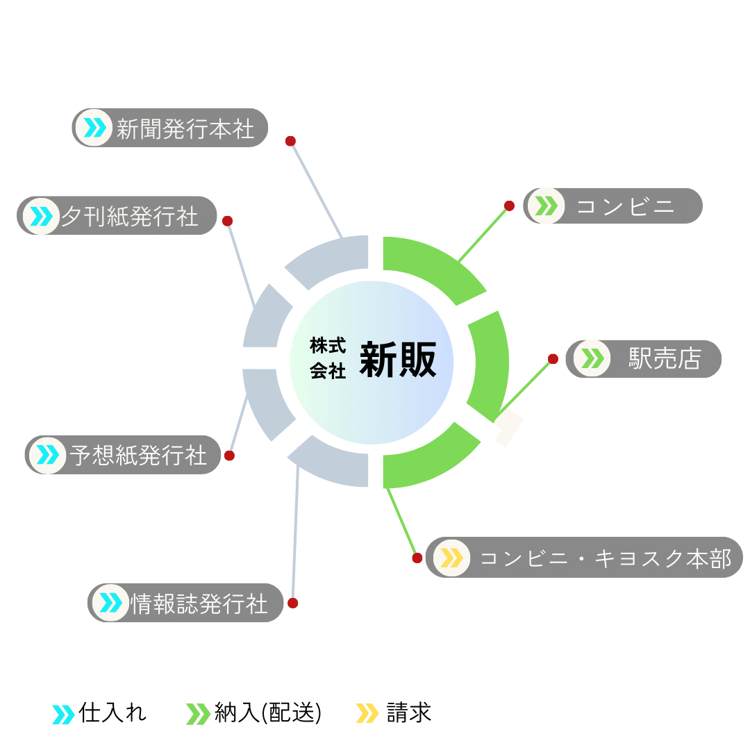 株式会社新販は朝日新聞・日刊スポーツのグループ企業であり、近畿圏のコンビニ、キヨスクなどに、主に新聞、情報誌、予想紙を納入しています。各店様に毎日商品をお届けする自社配送便を持ち、その配送エリアは大阪府下全域、兵庫、奈良、和歌山の大部分に及びます。また各地の新聞販売所と提携し、その納入エリアは近畿圏はもちろんのこと、中国、四国、北陸までに至ります。